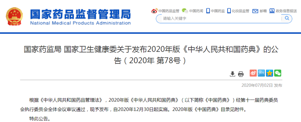 7月2日,國家藥品監督管理局、國家衛生健康委發布公告,正式頒布2020年版《中華人民共和國藥典》(以下簡稱《中國藥典》)。新版《中國藥典》將于今年12月30日起正式實施。